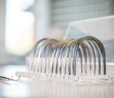 Die Brackets (aus Metall oder Keramik) werden für die Dauer der Behandlung auf die einzelnen Zähne geklebt. An ihnen werden dann die Bögen befestigt – zu Beginn eine eher flexible Variante, die nach und nach durch starrere Drähte ersetzt werden. Diese ziehen die Zähne nach und nach in die gewünschte Position.
